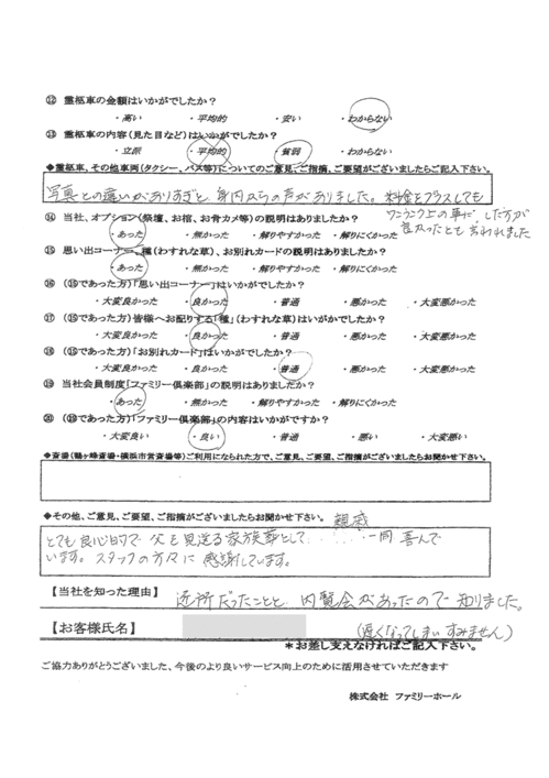 ファミリー倶楽部が大変良いサービスです。とても心のこもった対応をしていただき、良い葬儀となりました。…