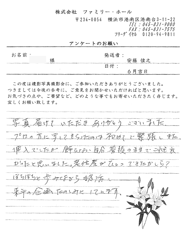 ファミリーホール港南台斎場にて5月24日に行わせていただきました「第2回 感謝祭」の中で、初の試みとなりましたが、「遺影写真撮影会」させていただきました。