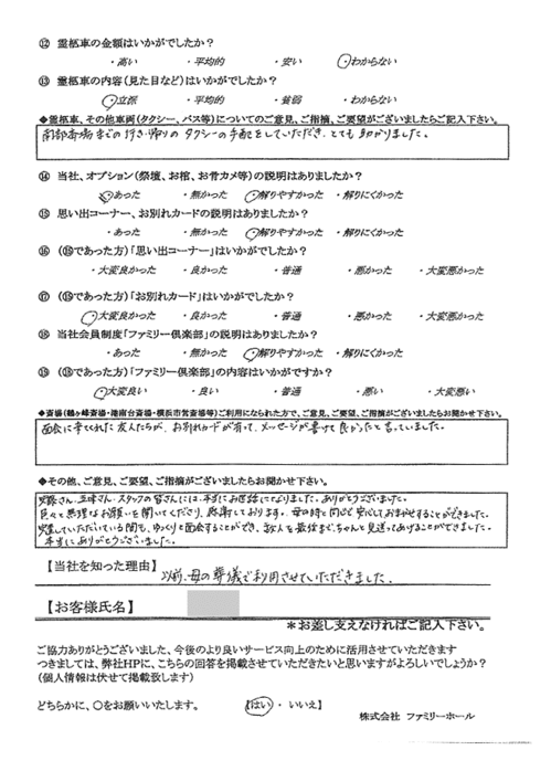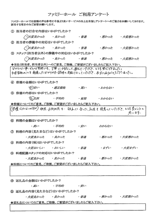 ファミリー倶楽部が大変良いサービスです。とても心のこもった対応をしていただき、良い葬儀となりました。…