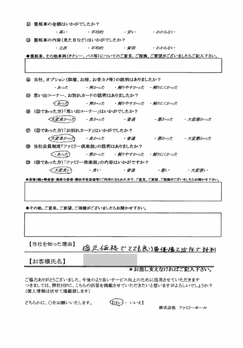 ファミリー倶楽部が大変良いサービスです。とても心のこもった対応をしていただき、良い葬儀となりました。…