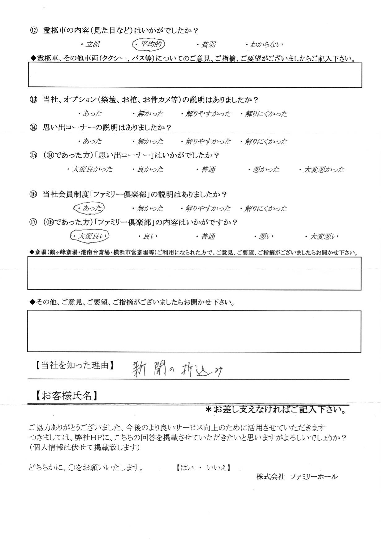 連絡がスムーズで、花祭壇の希望の色調で良かった。港南台斎場の安置スペースは明るくや安置状態もていねいで良かった。