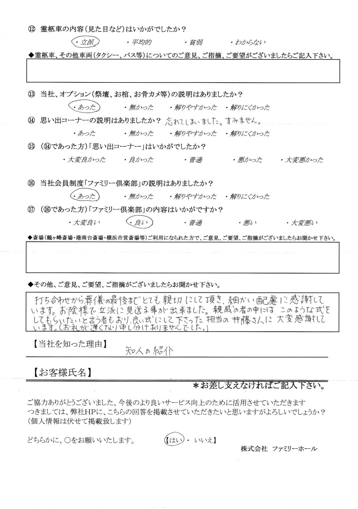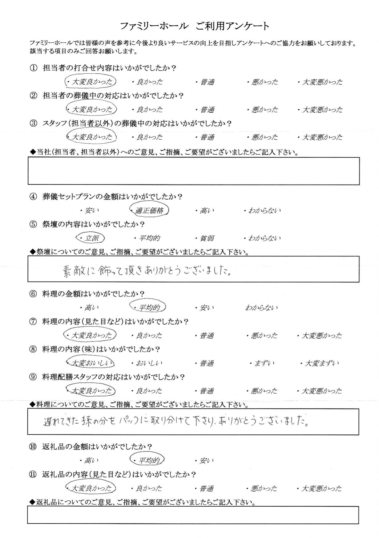 知人の紹介で依頼、打ち合わせから葬儀の最後までとても親切にして頂き、細かい配慮に感謝しています。親戚からも「このような式をしたい」との声がありました。