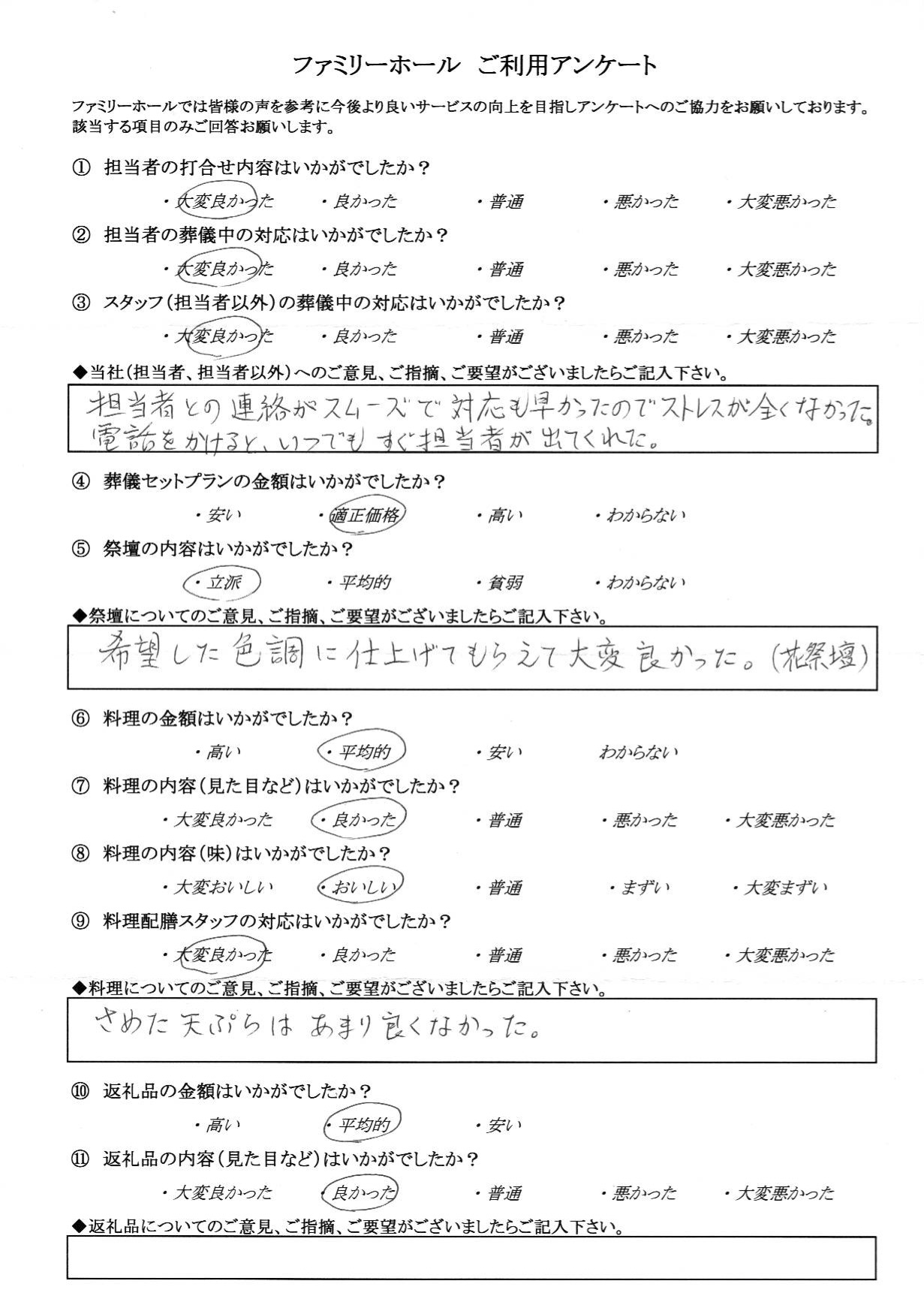 知人の紹介で依頼、打ち合わせから葬儀の最後までとても親切にして頂き、細かい配慮に感謝しています。親戚からも「このような式をしたい」との声がありました。