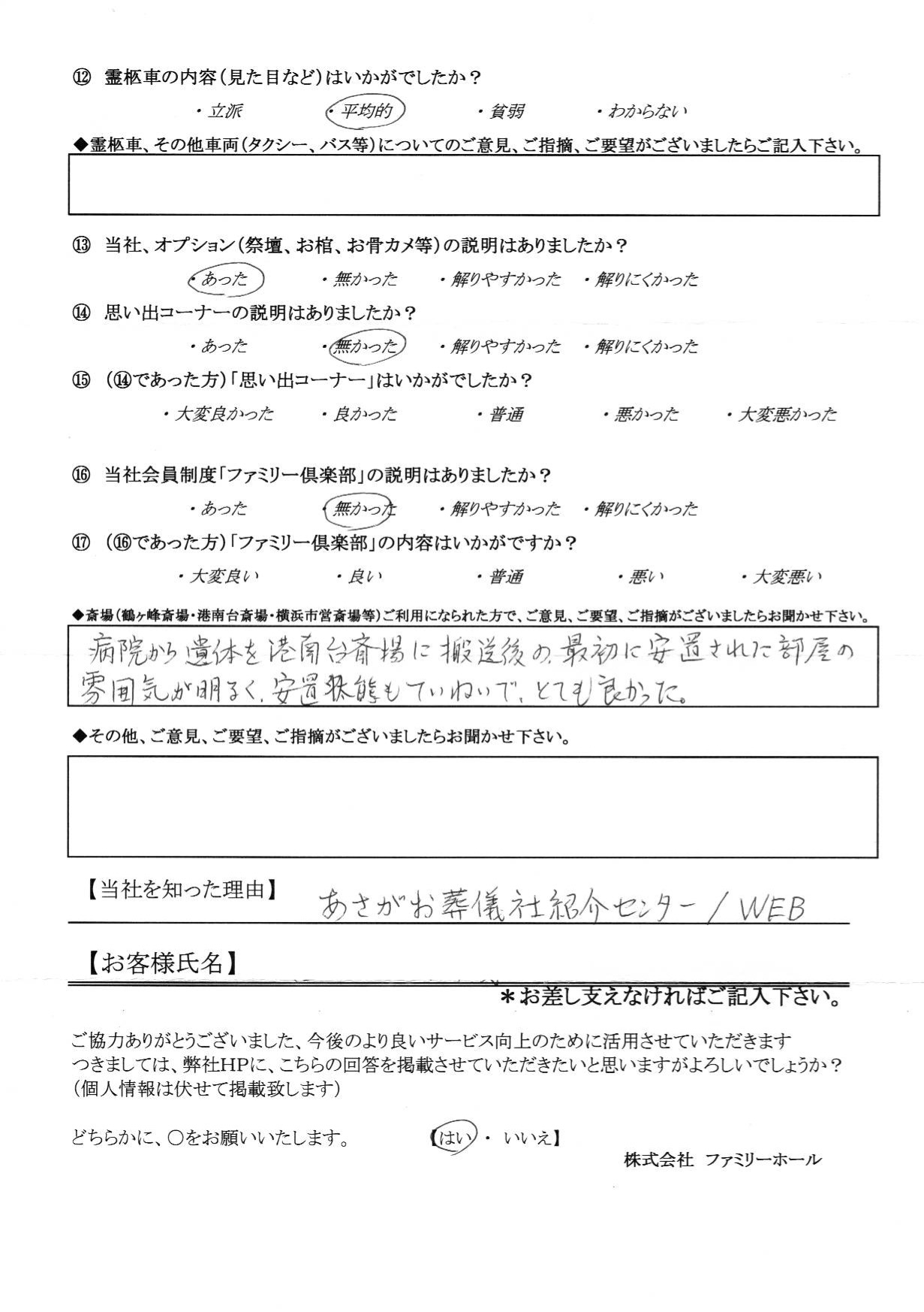 連絡がスムーズで、花祭壇の希望の色調で良かった。港南台斎場の安置スペースは明るくや安置状態もていねいで良かった。