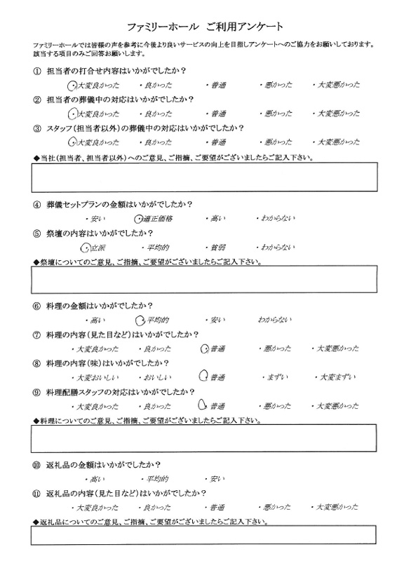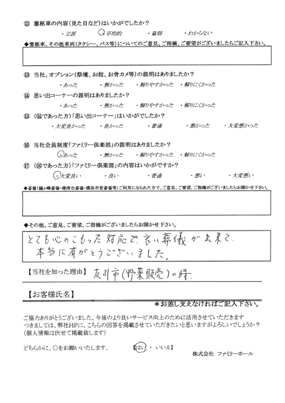 ファミリー倶楽部が大変良いサービスです。とても心のこもった対応をしていただき、良い葬儀となりました。本当にありがとうございました。