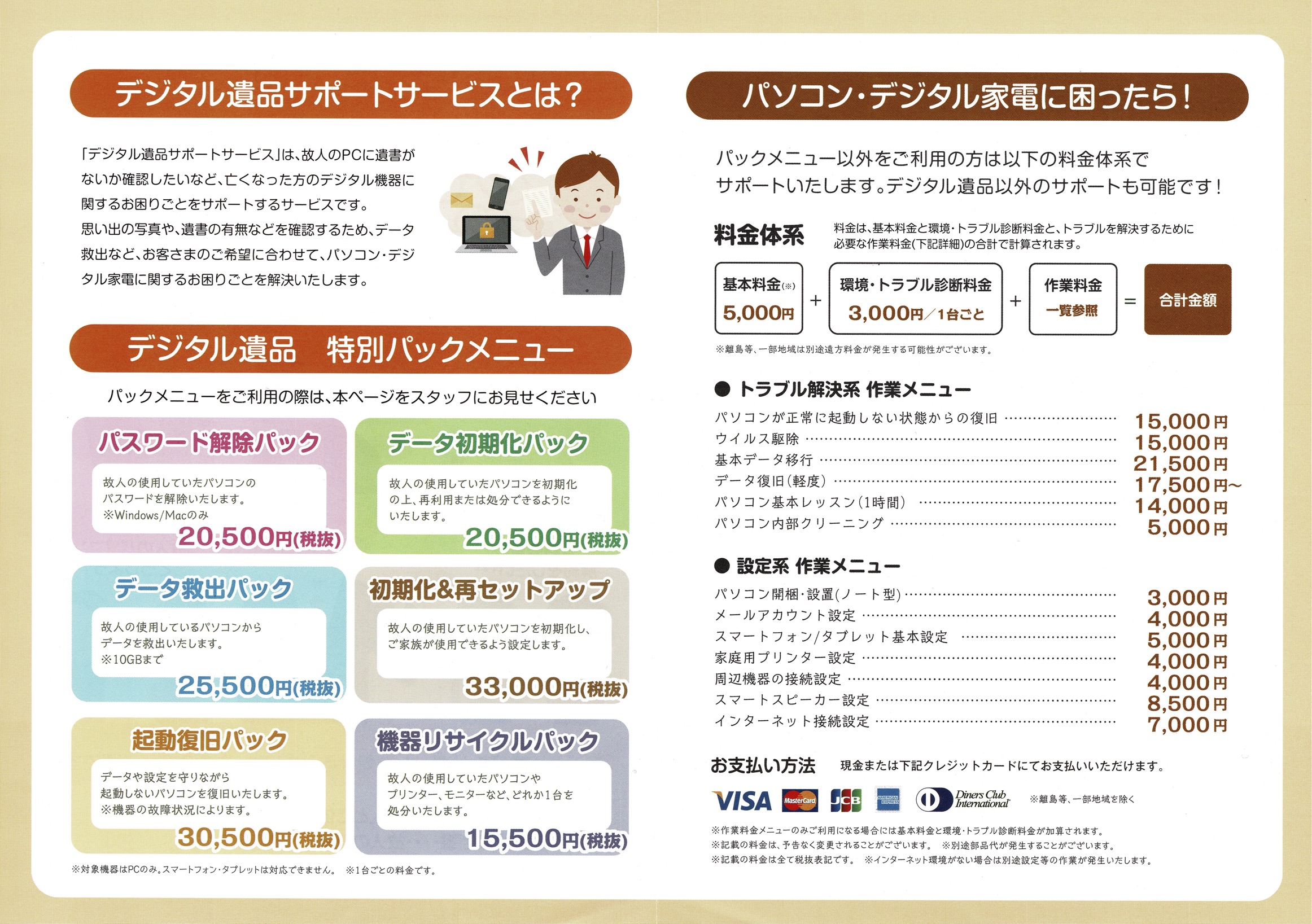 故人様が生前お使いだったパソコンや携帯電話、オンラインの有料会員登録の解約など、どうしたらよいかわからないと気には『デジタル遺品サポートサービス』をご利用ください。