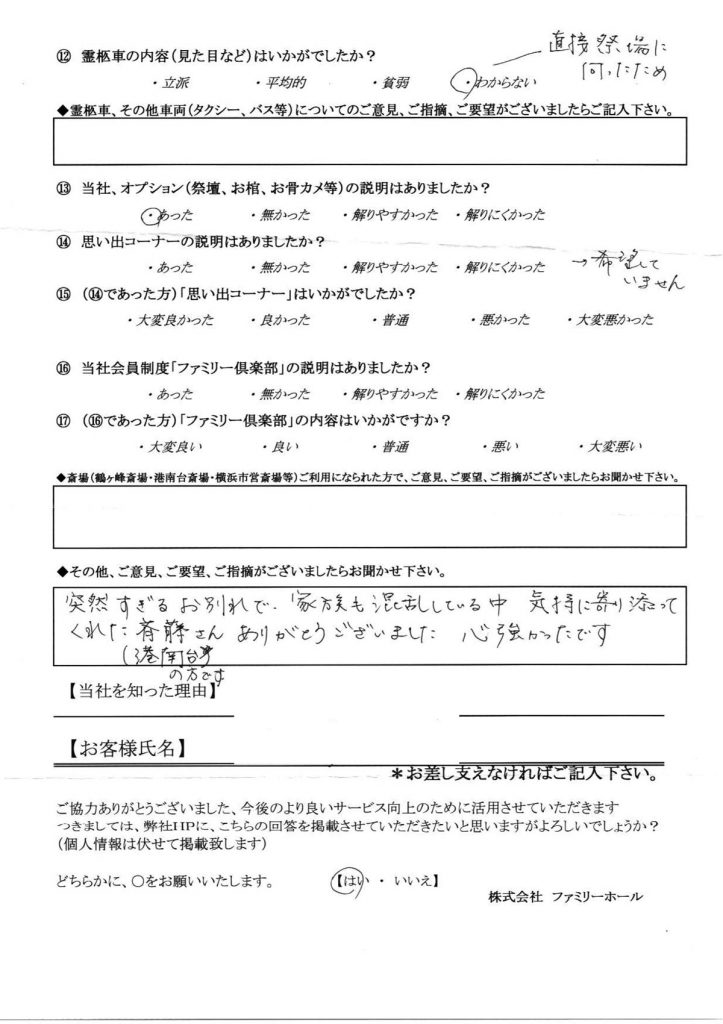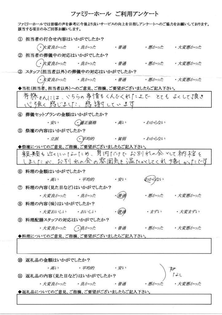 家族だけで、来訪者に気を遣うことなくとても良い葬儀ができました。またリーズナブルな金額で済み助かりました。