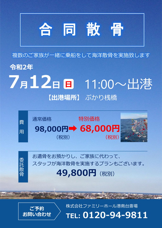 合同散骨は複数のご家族が乗船しご家族が行う散骨。委託散骨は遺骨をお預かりし当社スタッフが行う散骨です。