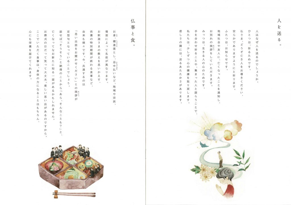 お通夜・告別式で振舞われる、通夜振る舞いや精進落としのご会食の場で、お選びいただけます精進料理のご案内です。 精進料理のご案内【見開き4ページ】(PDFが開きます)