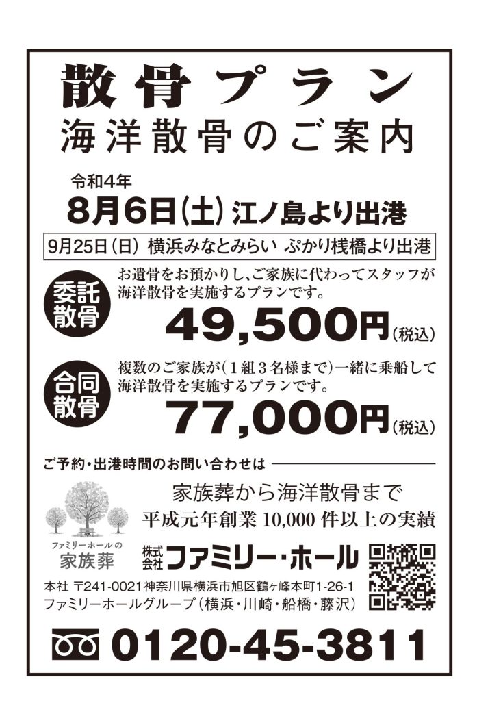 ファミリー・ホールグループの海洋散骨プランは、大型船をチャーターし、複数のご家族が一緒に乗船して海洋散骨を実施する合同散骨や、御遺骨をお預かりし、ご家族に代わってスタッフが海洋散骨実施する委託散骨、ご遺族様のご希望の日時と出港地から海洋散骨を実施するプライベート散骨など、ご希望に合わせてお選びいただくことができます。