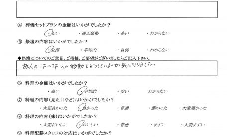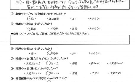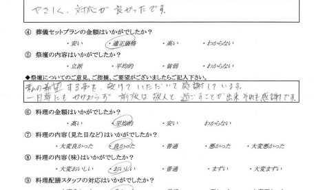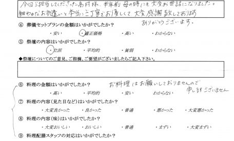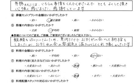 家族だけで、来訪者に気を遣うことなくとても良い葬儀ができました。またリーズナブルな金額で済み助かりました。